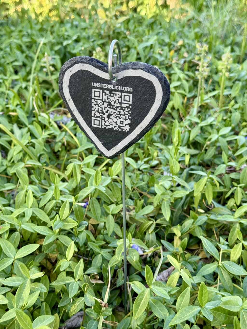 Schieferplatte in Herzform (10×10 cm) mit wetterfestem Design. Der präzise gelaserte QR-Code sorgt für eine langlebige, hochwertige Optik und Funktionalität